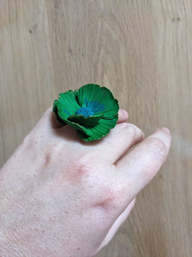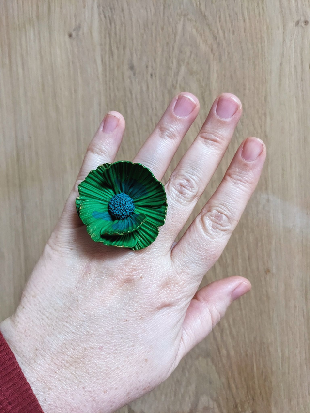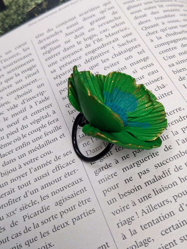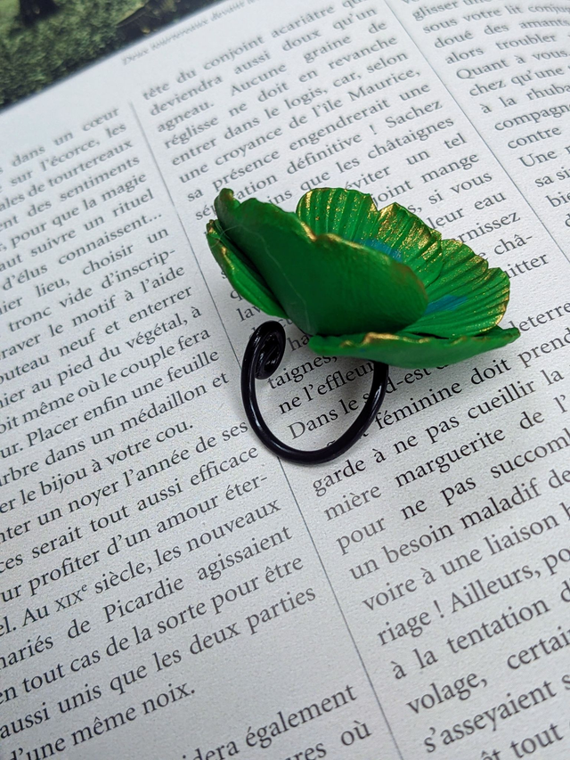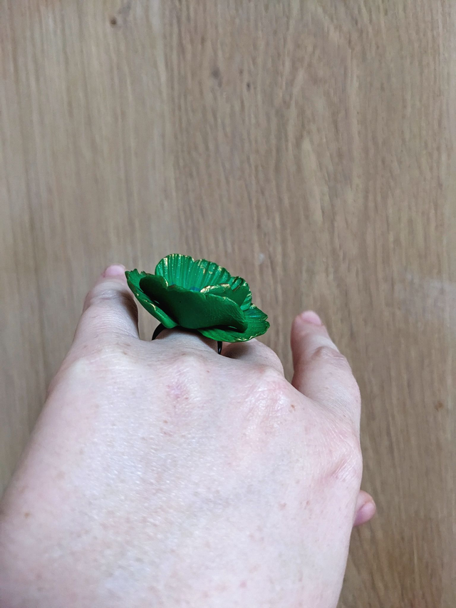 Je trouve qu'elle porte bien son nom cette jolie bague. Deux nuances de vert, bien vives avec le bord des pétales delicatement souligné en doré.