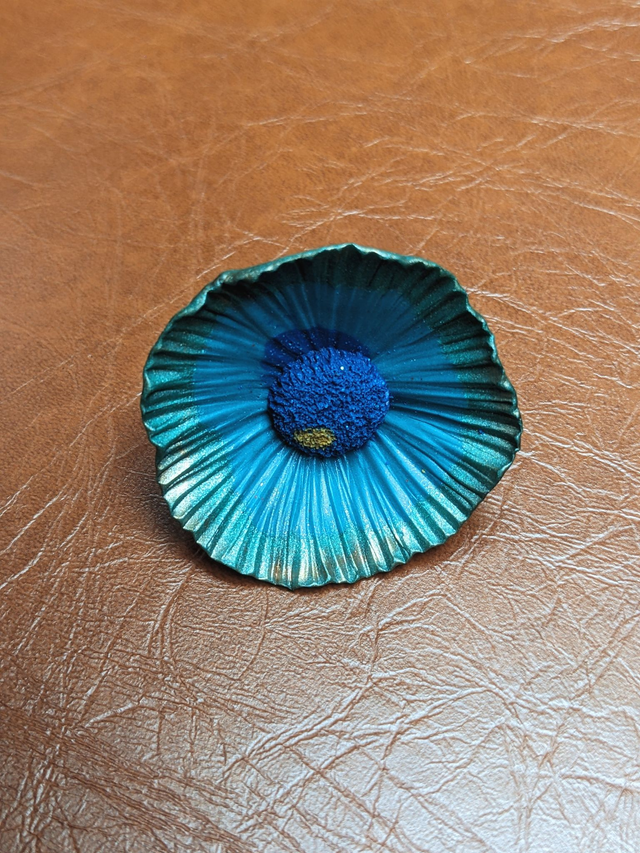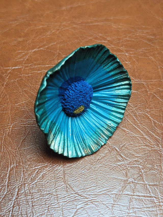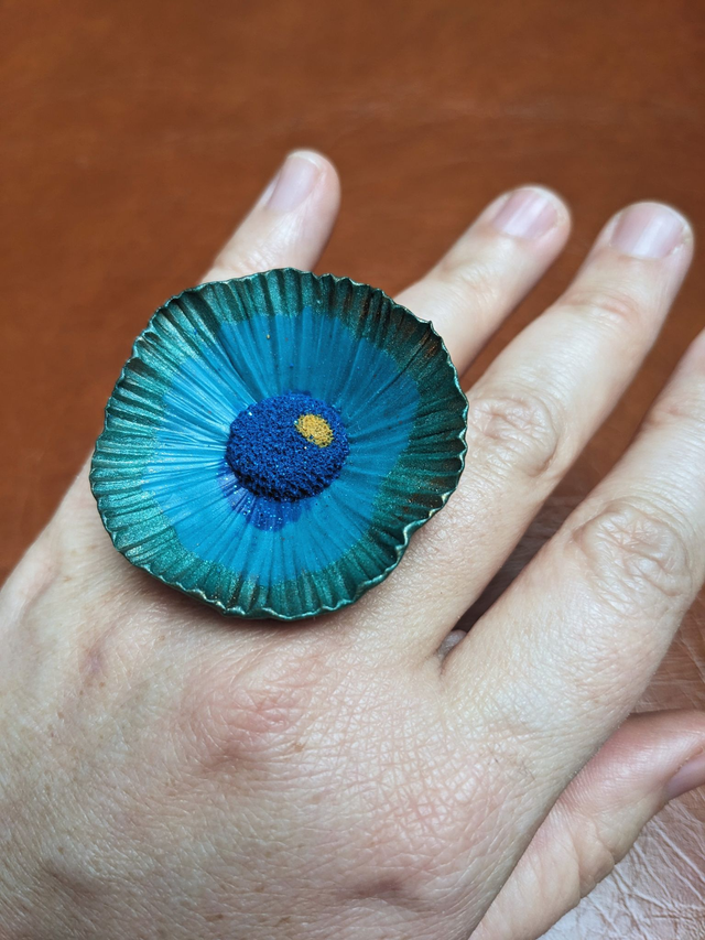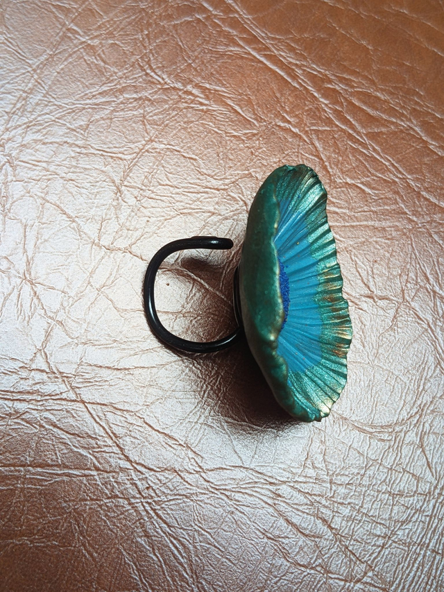 Un dégradé de vert au bleu évocant les vacances... Une fleur "lagon" d'environ 4,5cm de diamètre pour une profondeur de 1,5cm, dotée d'un anneau confortable, flexible et ajustable...ça te tente ? Poids plume : moins de 10g.