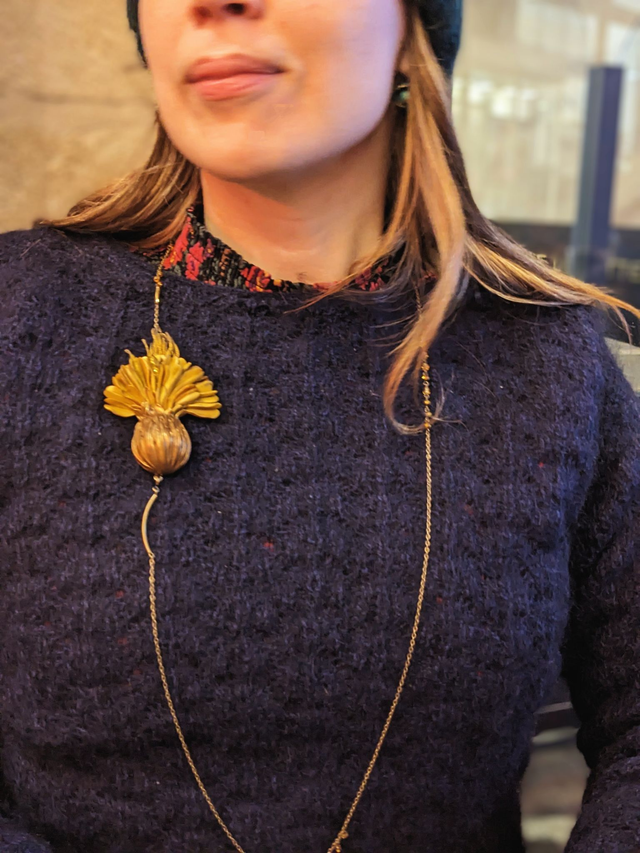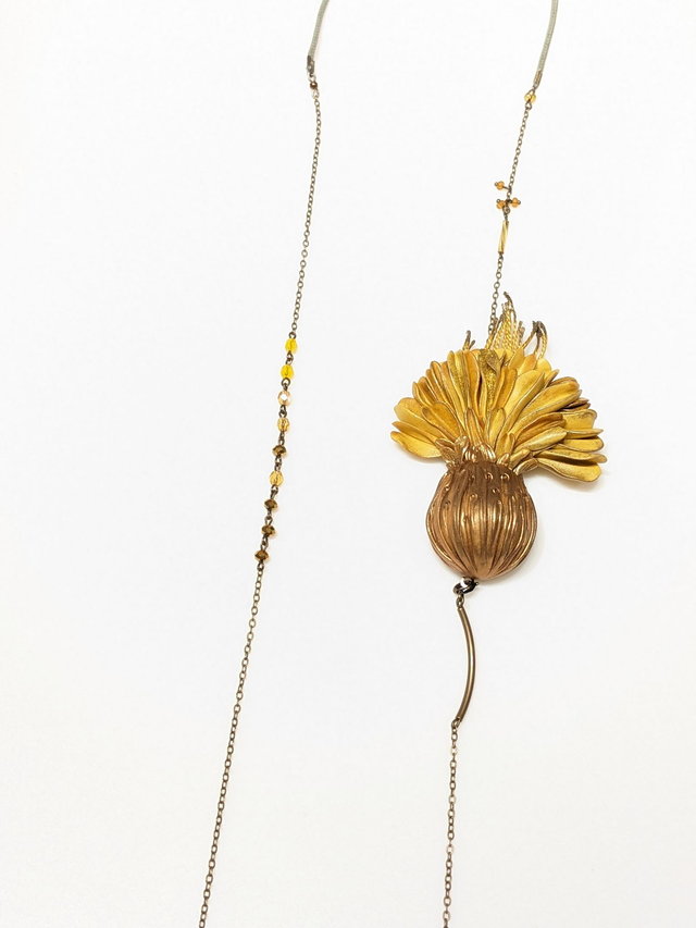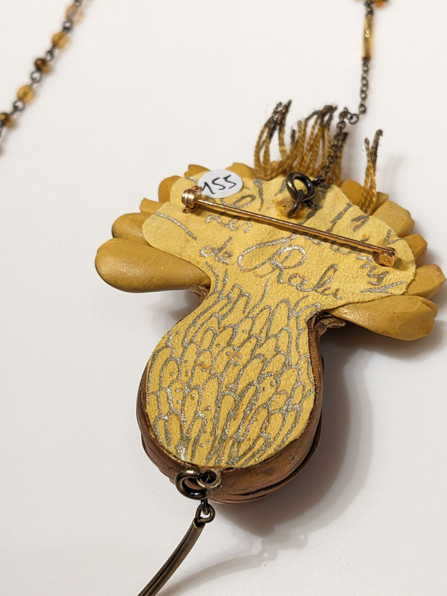 Chardon (moutarde douce), non piquant, modelé pétale par pétale à la main, en argile synthétique. Il est doublé de cuir décoré à l acrilique. L'ensemble des parties métalliques sont en laiton (doré à l'or fin pour l'accroche de la broche).