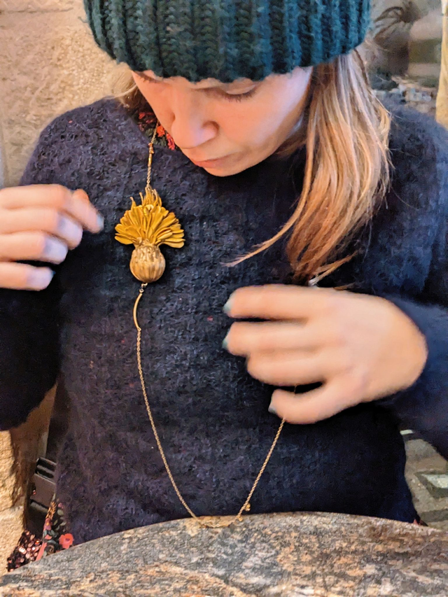 Petit détail technique : pour plus de confort et pour indiquer le centre du sautoir, à l'arrière du cou la chaîne est remplacée par un lasset en coton gris-vert. Si tu le souhaites, cette partie peut être en chaîne.