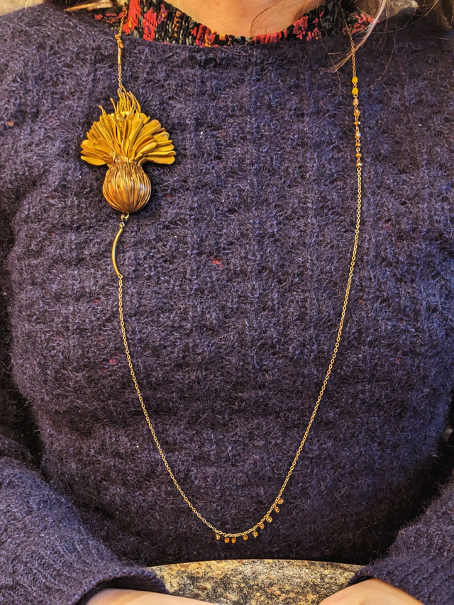Peut se porter en sautoir asymétrique en accrochant la fleur sur le vêtement et il est également possible de garder uniquement la fleur en broche, les chaînes étant amovibles. Il peut ainsi s'adapter à l évolution de ta tenue lors d'une sortie (le porter en broche sur ta veste, par exemple, puis en sautoir sur ta robe ou chemise).