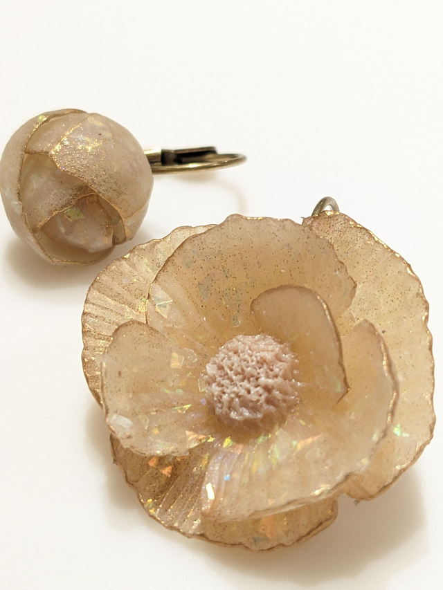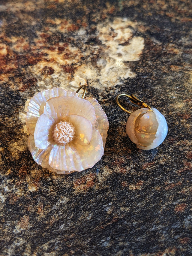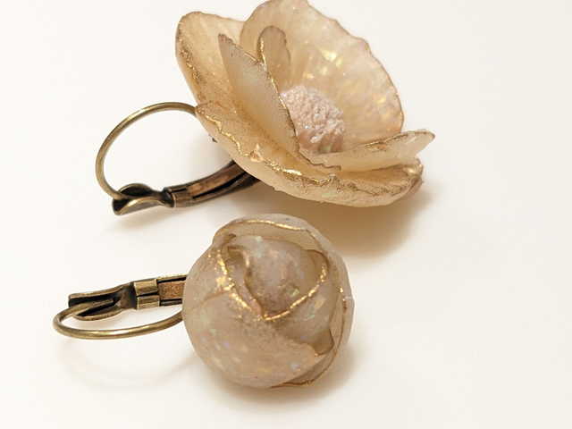 Dormeuses en laiton aux fleurs glacées. Translucides aux éclats arc en ciel, les fleurs sont modelées sans moules, en argile polymère.